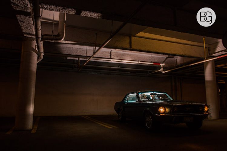 I’m going to call this one “Rainy day love story at paaaarty central!” (Sexy smooches in a rad old Ford Mustang are an added Hollywood-ish bonus touch!)